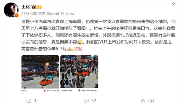 前不久有消息称小米YU7推迟发布,王化对此回应称上市发布时间并未改变,依然是之前预告的今年6-7月。