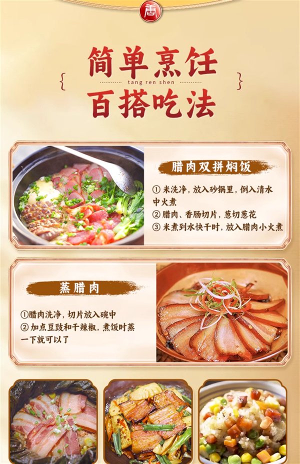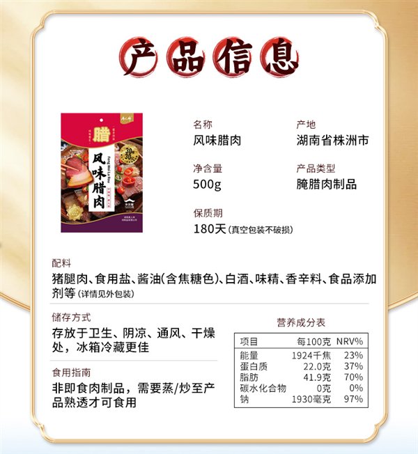 配料:猪腿肉、食用盐、酱油(含焦糖色)、白酒、味精、香辛料、食品添加剂等(详情见外包装)。