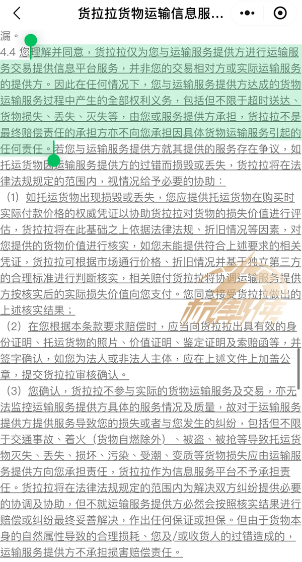 因此在任何情况下,您与运输服务提供方达成的货物运输服务过程中产生的全部权利义务,包括但不限于超时送达、货物损失、丢失、灭失等,由您或服务提供方承担,货拉拉不是最终赔偿责任的承担方,亦不向您承担因具体货物运输服务引起的任何责任。