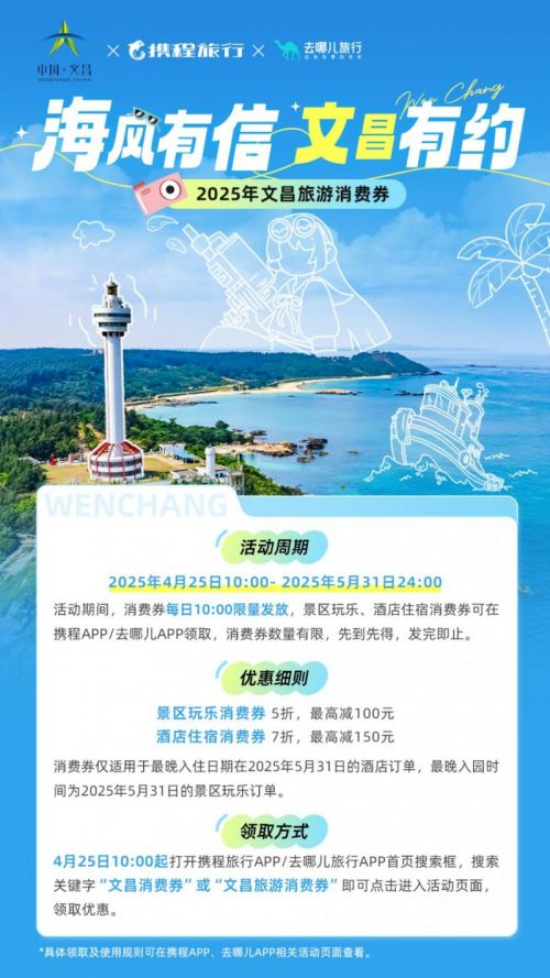椰风轻拂南海之滨,星河辉映航天新城。2025年4月25日,文昌市以“海风有信 文昌有约”为主题,正式启动2025年度旅游消费券发放活动。活动通过携程旅行、去哪儿旅行面向全国游客发放文旅惠民补贴,涵盖酒店住宿7折最高减150元、景区门票5折最高减100元的重磅优惠,旨在激发文旅消费活力,推动文昌“航天文旅+生态康养+侨乡风情”多元业态深度融合。活动周期精准覆盖2025年五一黄金周等关键节点,正值春日错峰出行大好时光,诚邀广大游客深度体验椰林碧海的生态之美与百年骑楼的人文底蕴,全面彰显文昌打造“航天旅游之都”的非凡潜力。