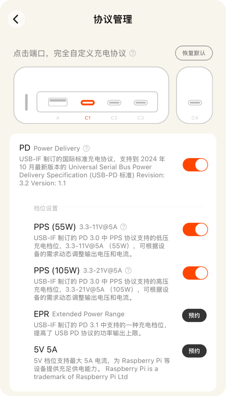 在可视化的基础上,通过 App 还可以轻松完成对每一个端口的协议开关与功率无极调节。据悉,AI 小电拼目前已支持双档位 PPS,真正做到把选择权交给用户自己。此外,App 提供睡眠充/超速充/小家电模式等多个情景模式,用户亦可进行选择切换,以适配自身需求。