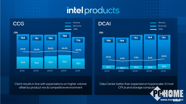 英特尔一季度进行了组织架构调整,将网络与边缘计算事业部 (NEX) 整合至CCG和DCAI,因此收入精简至四个业务板块:英特尔产品——客户端计算事业部(CCG)、数据中心和人工智能 (DCAI),英特尔代工厂(Intel Foundry)以及其他。第一季度,英特尔产品总收入118亿美元,同比下降3%,当中CCG业务收入76亿美元,同比下降8%;DCAI收入41亿美元,同比上升8%,主要因素包括今年2月英特尔推出面向数据中心的配备性能核心 (P 核) 的全新英特尔至强6处理器,以及面向网络和边缘应用的至强6处理器,可在各种工作负载下增强性能和效率。