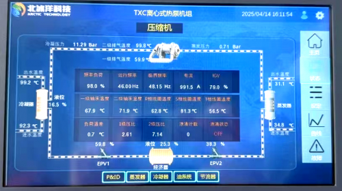 传统热泵技术受制于压缩机和冷媒性能,出水温度多停留在60℃-80℃区间,难以满足工业高温需求。而北冰洋99℃大压比离心热泵机组通过超高效离心压缩机技术、新型环保冷媒适配与智能温控系统的协同创新,成功突破技术壁垒,将热泵出水温度提升至99℃,填补了工业高温热泵领域的空白。