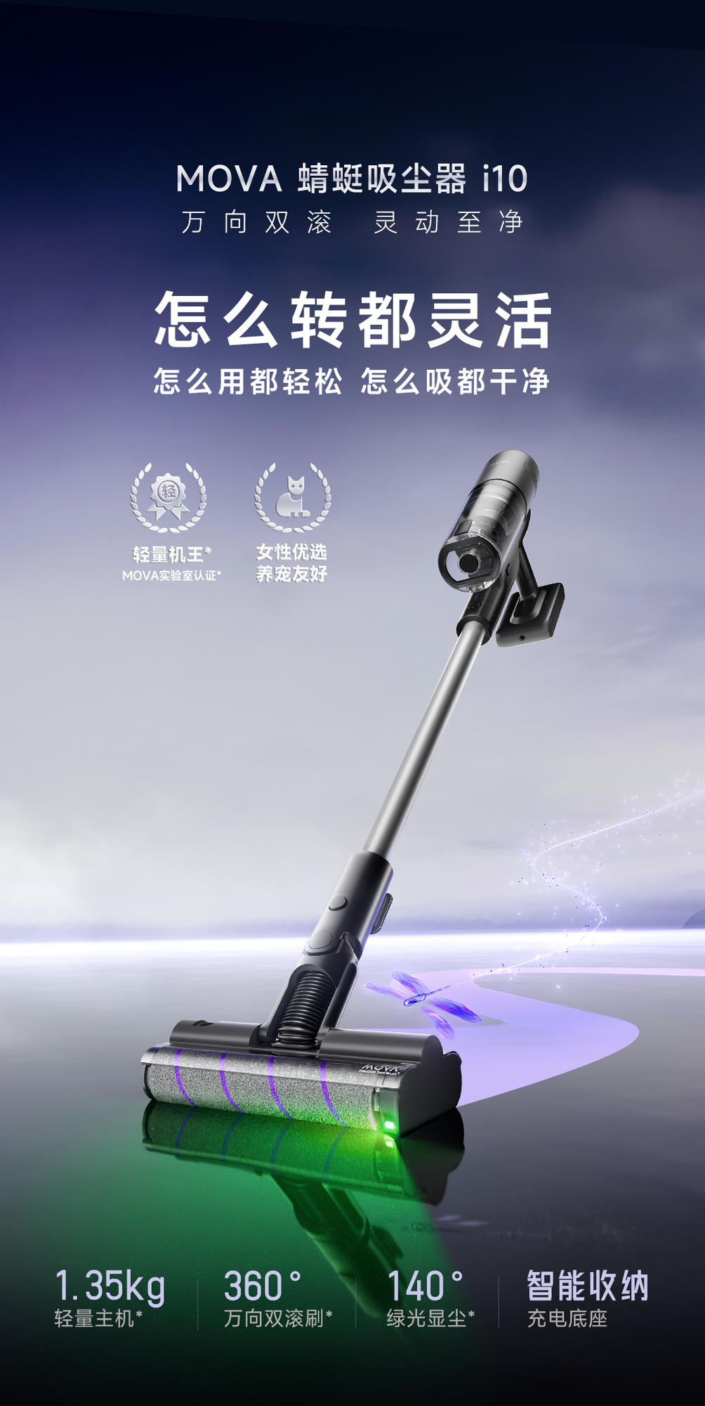 MOVAi10 主机重量仅为1.35kg,主机能够轻松上下楼梯、台阶,内置的大容量电池可实现持久续航,无论日常维护还是深度清洁,均能满足全屋清洁需要,更适配亚太地区100平米以下小户型清洁需求。其轻量化设计让女性也能轻松单手操作,减轻清洁负担。