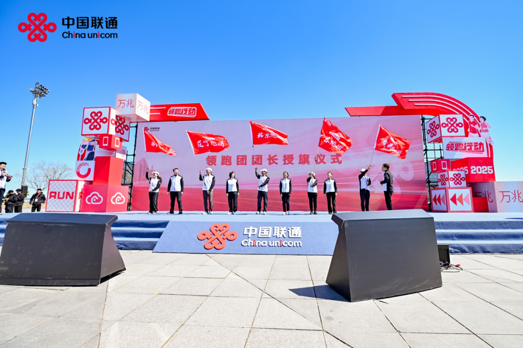 在领跑团授旗仪式上,来自五大赛事省份的联通跑团团长接过旗帜,标志着中国联通的专业化跑步社群正式组建。