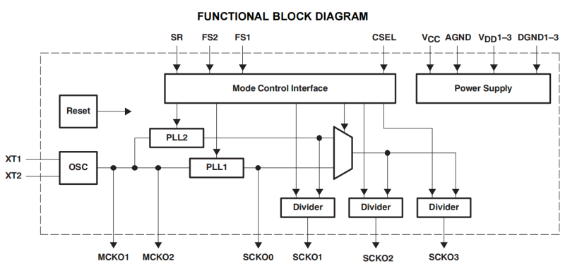 该器件的关键创新点体现在三个方面:其一是实现了50ps级别的超低时钟抖动(典型值),这相当于在27MHz时钟周期内误差仅占0.135%,对于192kHz/24bit的高解析度音频系统,这样的性能指标足以保证数模转换的纯净度;其二是支持6种标准采样频率(32-96kHz)的动态切换,通过FS1/FS2/SR控制引脚即可实现硬件级的实时配置;其三是独特的零PPM误差特性,这在需要长时间稳定运行的汽车电子系统中尤为重要,避免了传统时钟方案因温漂或老化导致的频率偏移问题。