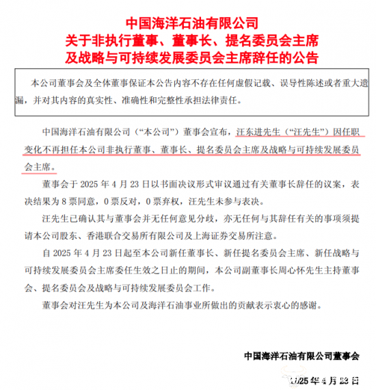 据中国海油发布的公告明确显示,汪东进因任职变化不再担任公司董事长等职务。自4月23日起至新任董事长、新任提名委员会主席、新任战略与可持续发展委员会主席委任生效之日止的期间,公司副董事长、总经理周心怀主持董事会、提名委员会及战略与可持续发展委员会工作。