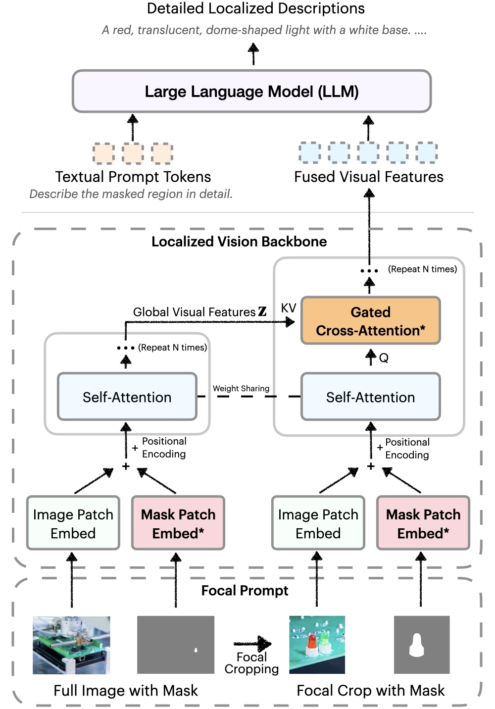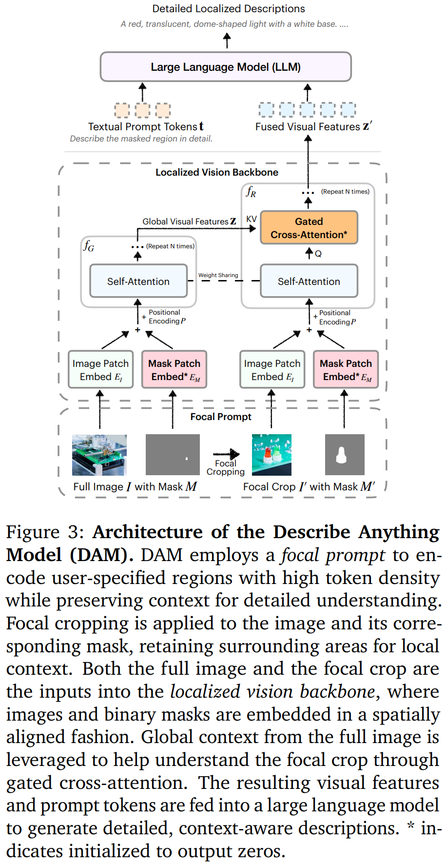 局部视觉主干网络,引入了一个集成全局特征和局部特征的局部视觉主干网络。图像和掩码在空间上对齐,门控交叉注意力层将局部细节线索与全局上下文融合。此外,新参数初始化为零,从而保留预训练的能力。这种设计能够产生更丰富、更具有上下文感知能力的描述。