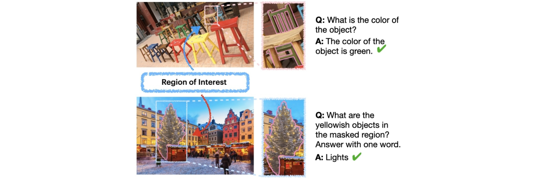 除了生成描述之外, DAM 模型无需额外的训练数据即可回答有关特定区域的问题。例如用户可以询问该区域的属性,模型会利用其对局部区域的理解,提供准确的、基于上下文的答案。