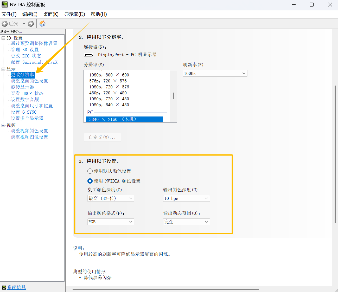 然后找到显示选项下的“更改分辨率”选项。进入之后,在第3步的“使用NVIDIA颜色设置”这里将“桌面颜色深度”、“输出颜色深度”、“输出动态范围”这三项拉满,再点击应用就完成了。