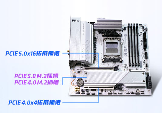 蓝宝石PURE极地B650MWIFI 主板采用了蓝宝石独特的极地纯白设计语言,简洁大气的白色基调,搭配精心设计的线条与元素,无论是单独欣赏还是装机打造白色主题“海景房”,都能展现出无与伦比的科技美感,满足当下玩家对于主机个性化与颜值的追求。作为AMD锐龙9000系列处理器的最佳搭档,PURE极地B650MWIFI主板全面支持AM5插槽,配备12+2+1路数字供电模组与双8PINCPU供电接口,能够兼容AMD锐龙7000、8000、9000系列台式机处理器,轻松驾驭包括9950X、9950X3D等在内的高端处理器,稳定释放其极限性能,超频潜力再创新高。