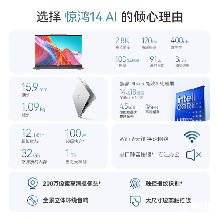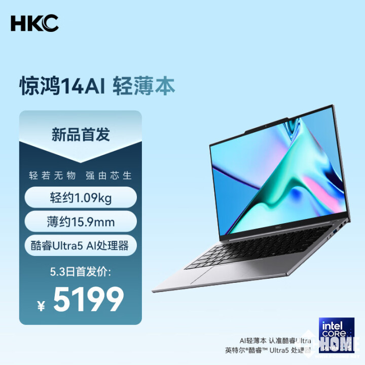 HKC惠科已旗下首款全面屏AI轻薄笔记本电脑惊鸿14 AI开启预售,搭载酷睿Ultra 5 125H处理器,机身重量仅有1.09kg,首发售价为5099元。