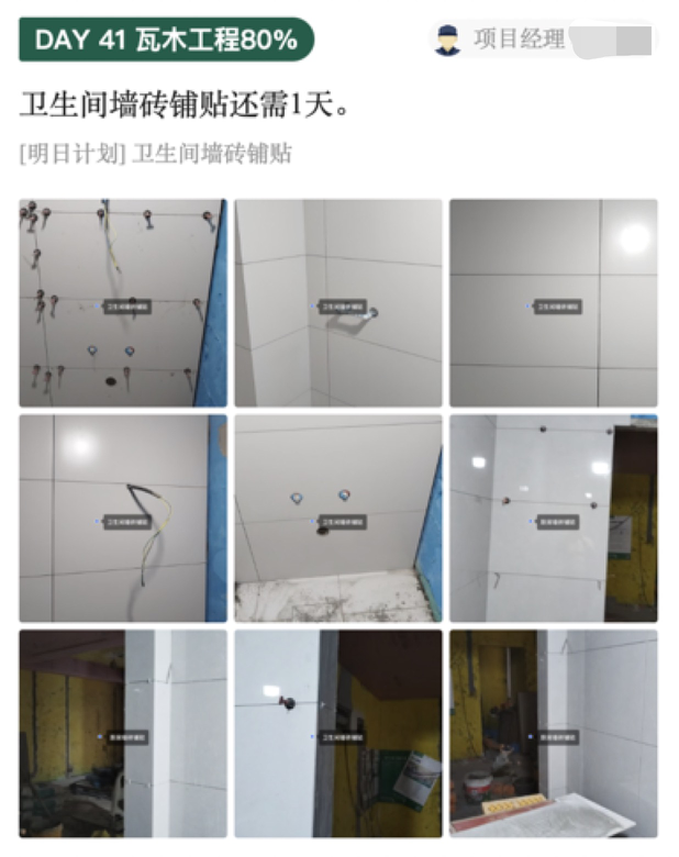装修过程中会拉用户进一个企微群,项目经理会每天在群里播报施工进度,如果有巡查人员,也会在群里发巡查照片。群里也有服务人员的直系领导,如果出了事能找到人,施工地方也会安装摄像头,用户可以通过小程序每天查看装修情况,也能通过小程序看项目经理的播报,甭管你会不会看、能不能看懂,对于工人至少也会有震慑和监督作用。
