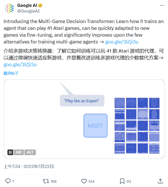 即便是谷歌2022年推出的多游戏智能体Transformer,能玩41款雅达利游戏,但也依赖于大量预先学习的数据。