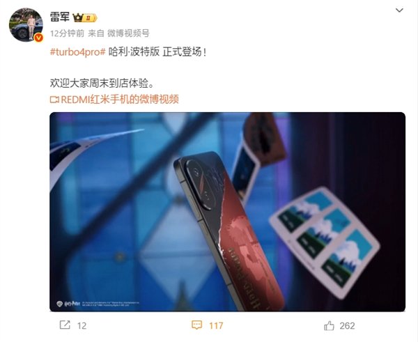 快科技4月26日消息,今早,雷军发文晒出了REDMI Turbo 4 Pro哈利·波特版的宣传片,称欢迎大家周末到店体验。