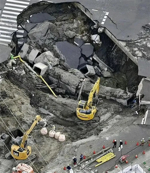 事故发生后,初期塌陷区域宽10米、深 6米,后因地下污水管道破裂,大量水流冲刷导致路基持续塌陷,最终形成宽40米、深15米的巨型天坑。