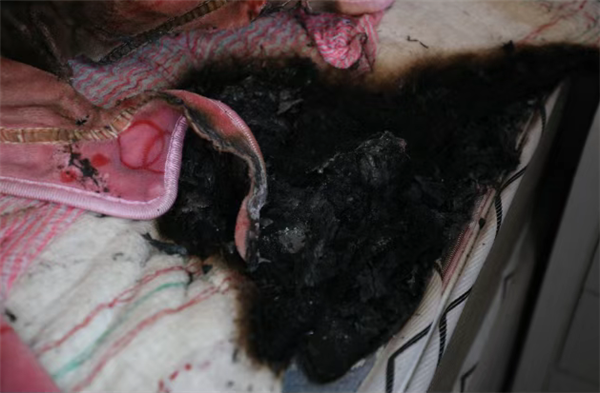 只见枕头下方的被褥和床垫正处于燃烧状态,已经被烧黑了一大片,火势还在隐隐蔓延。