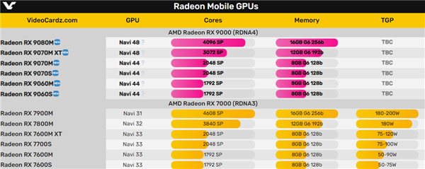 Navi 48中等核心的有两款,一是RX 9080M,4096个流处理器(64个CU),256-bit 16GB显存(自然然都是GDDR6),而是RX 9070M XT,3072个流处理器(48个CU),192-bit 12GB显存。