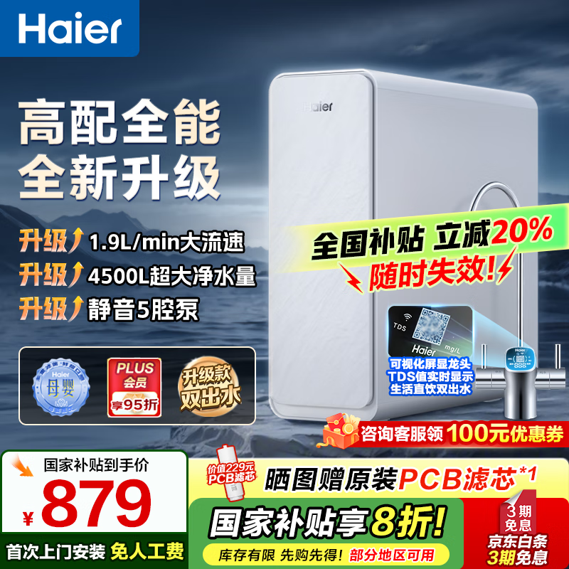 海尔Haier自然湃Pro家用净水器600G厨下式RO反渗透过滤
