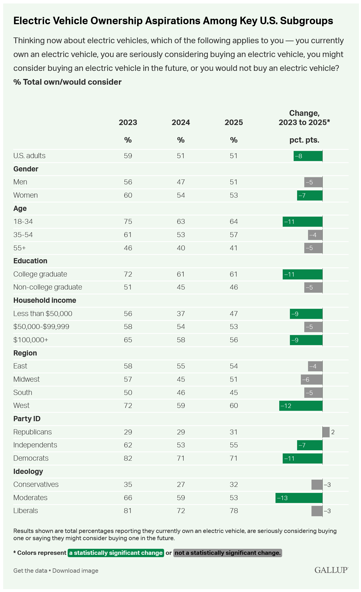 电动车最积极的支持者——即已拥有或正在认真考虑购买的人群——从2024年的16%降至今年的11%。尽管这一下降具有统计显著性,但原因尚不明确。下降趋势在高收入群体和年轻人中更为明显。
