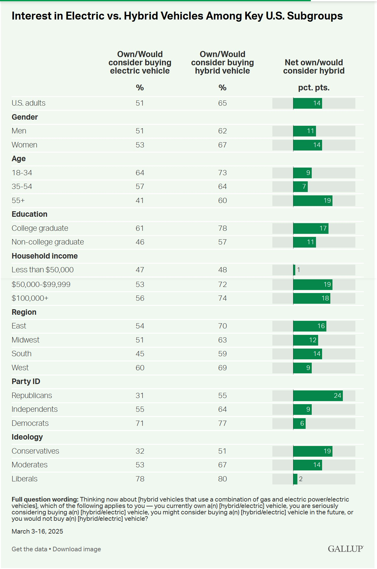 • 2023年对电动车兴趣最高的群体——民主党人、自由派、年轻人、大学毕业生和西部居民(自由派除外)。