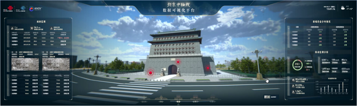 数护京脊·北京中轴线文物孪生智慧监管与保护项目,依托联通5G+物联网、高精度孪生建模以及大数据能力,多维度展示正阳门箭楼的病害、交通振源、人流、天气环境等情况,打造视觉元宇宙雏形,为文物建筑的病害监测、开展预防性保护、政府监管提供辅助决策依据,让“古都之脊”绽放新时代的光芒。