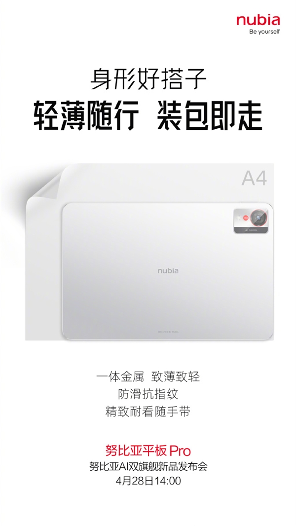 快科技4月27日消息,努比亚平板 Pro 将于4月28日正式发布,这是努比亚首款平板产品。