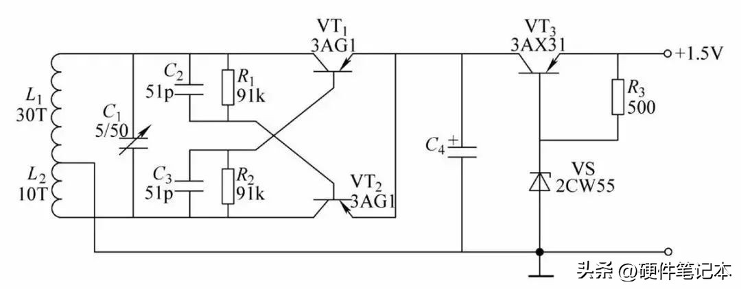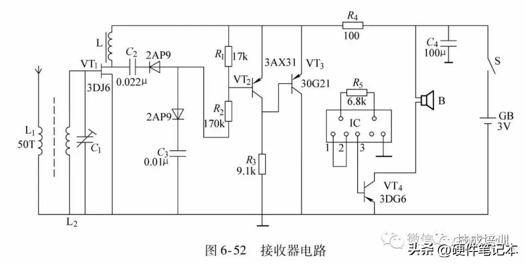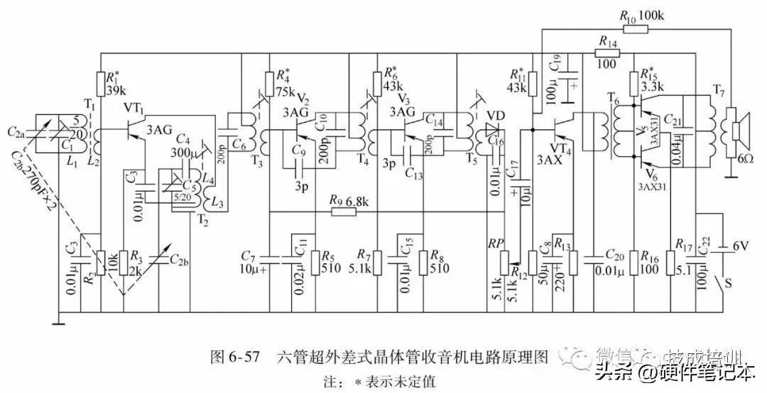 34.六管超外差式晶体管收音机电路原理图