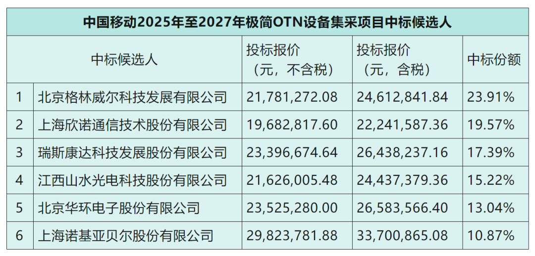 C114讯 4月27日消息(九九)中国移动采购与招标网日前发布2025年至2027年极简OTN设备集中采购项目中标候选人公示,格林威尔等六厂商中标。