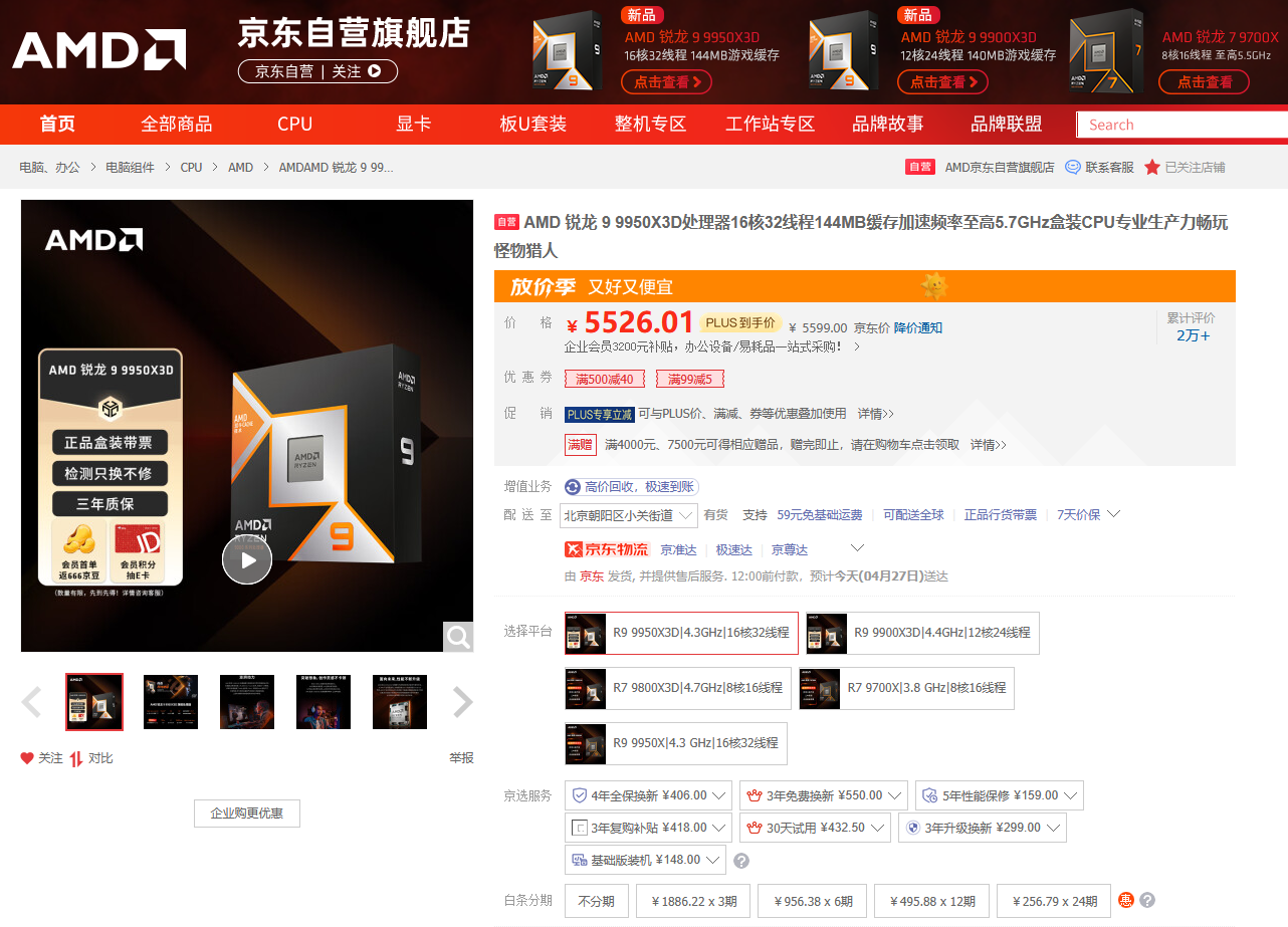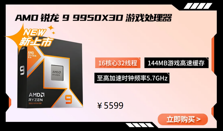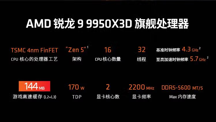 AMD锐龙9 9950X3D处理器采用了Zen 5架构与第二代3D V-Cache技术,拥有16核32线程配置,基础频率4.3GHz,最大加速频率可达5.7GHz。处理器内置了16MB二级缓存、64MB三级缓存,并额外堆叠了64MB的3D V-Cache,总缓存容量达到了144MB,显著降低了内存延迟,提升了数据传输效率,为广大玩家带来了革命性地游戏帧数提升。在扩展性与兼容性方面,AMD锐龙9 9950X3D采用AM5接口,支持DDR5内存,最大容量可达192GB,AMD承诺AM5平台将支持至2027年+,为用户提供了长远的升级空间,让大家可以放心战未来。