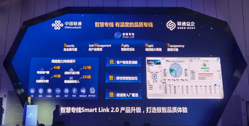 Smart Link智慧专线2.0通过升级智慧专线2.0客户网管,为客户提供更全面的业务性能可视、故障一键申告等功能;通过升级智慧调速能力,充分利用网络闲时资源,实现业务智能分析和敏捷调速;通过无源预覆盖缩短用户接入距离,接入一户,覆盖一楼,实现专线天级开通、100%带宽独享、端到端OTN硬管道品质,提供质优价廉的智慧专线服务,满足高品质泛在入算需求,助力中小企业数智化转型升级。