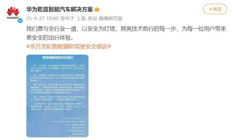 据财联社报道,华为乾崑智能汽车解决方案官方于4月27日发布《智能辅助驾驶安全倡议》。该倡议得到了11家汽车品牌高管的联合署名支持。参与署名的汽车品牌包括广汽、上汽、江汽、奥迪、东风猛士、岚图、深蓝汽车、北汽、阿维塔、赛力斯以及奇瑞汽车等知名企业。