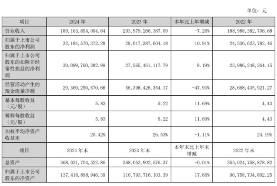 格力电器(000651)4月27日晚间披露年报,2024年实现营业收入1891.64亿元,同比下降7.26%;净利润321.85亿元,同比增长10.91%;基本每股收益5.83元。公司拟每10股派发现金红利20元(含税)。