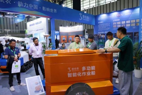 本次农机展现场,江苏叁拾叁带来的多款自主研发设备,构建起一套完整的智慧农业生态链。其中,第六代智能投饵船尤为引人注目,成为专业观众交流探讨的热门对象。该船集成北斗/ GIS导航与精准投喂技术,搭载的智能投饲装置能自动投放颗粒及粘性饲料,通过先进的投喂算法,实现饲料配给的动态优化,提高饲料利用率,降低人工成本。