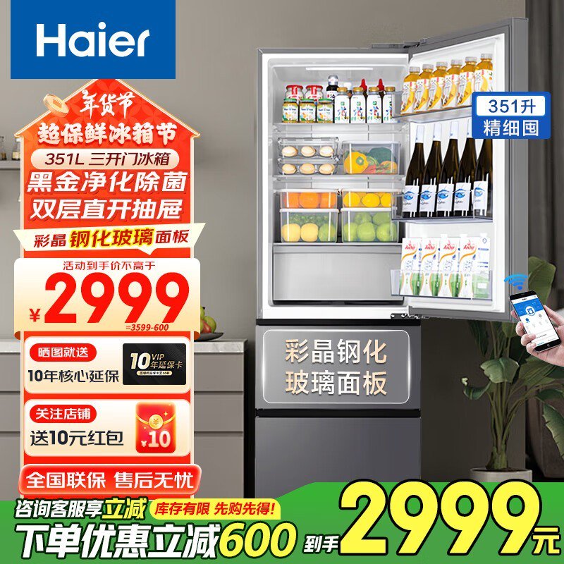 海尔351升法式三开门冰箱双变频节能京东特惠