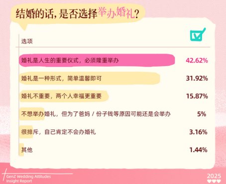 婚姻从来不是一个静态的制度安排,而是代际文化与社会价值观不断交汇与重塑的过程。Z世代正在以更真诚、更务实的方式重塑他们心中的“理想婚礼”,既摒弃浮华繁礼,也不愿将婚姻降格为“任务执行”。他们希望,婚姻是被尊重的选择,是与自我一致的表达,是温柔且坚定的陪伴确认。
