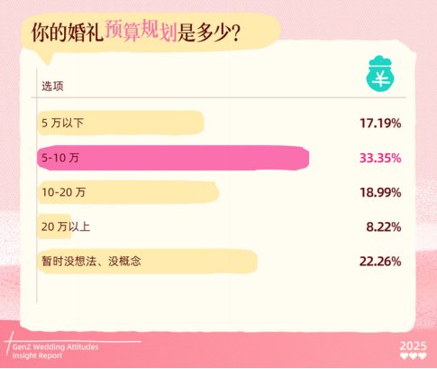 Soul App报告还指出,Z世代婚礼的新关键词包括:宠物证婚人、非遗文化元素、音乐主题、旅拍合体、灵活预算。数据显示,预算在5-10万元的婚礼最受欢迎。超过62%的受访者表示不再追求奢华,而更重视氛围与真实感。