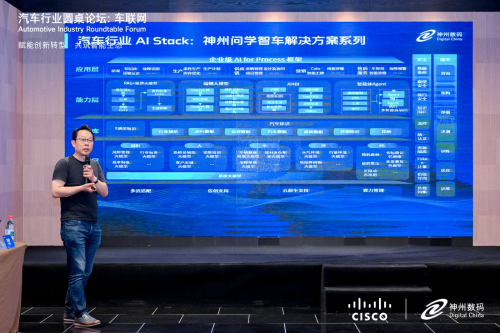 在技术方案展示环节,刘黎系统阐释了神州数码的智慧网联汽车全景布局:基于AI for Process理念,神州数码为车企打造覆盖研发、生产、供应链、销售及服务的全链路数字化解决方案;同时聚焦智能驾驶、智能座舱与智能网联三大核心技术,构建车载智能中枢。尤为引人注目的是,神州数码依托DeepSeek大模型与自研的神州问学平台,推出行业首创的“神州问学智车解决方案”。该方案通过算力层实现多云适配的智能资源调度,在模型层提供汽车行业专属AI模型的全生命周期管理,并在应用层落地智能招采、数字营销、AI客服等12个业务场景,助力车企实现管理智能化与业务敏捷化。