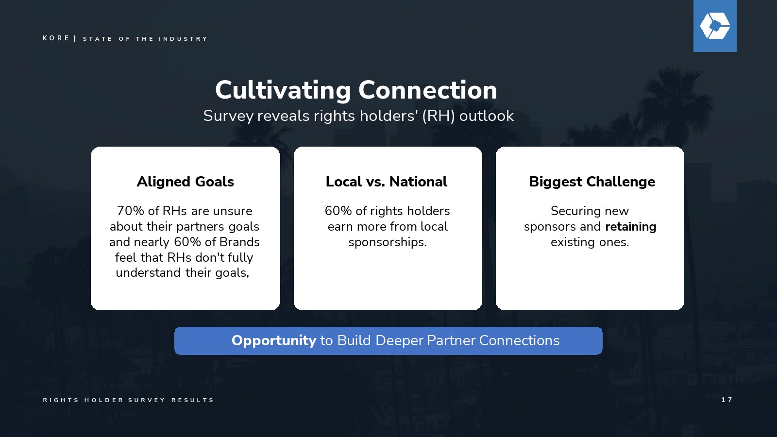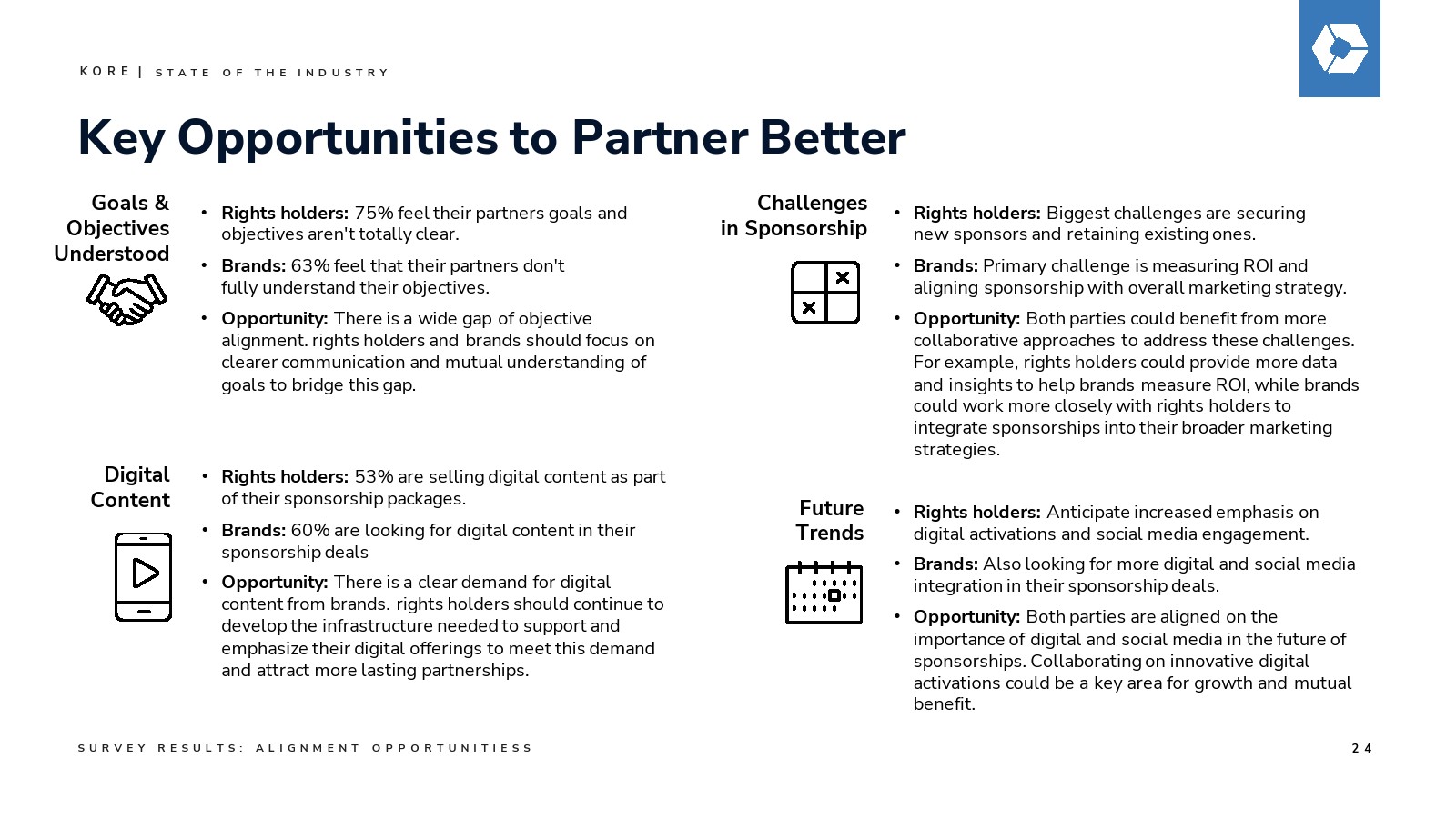 报告发现突显了一个关键需求——一致性是核心。虽然70%的权利方试图确定品牌合作伙伴的目标,但高达81%的受访者认识到与合作伙伴在目标、价值观和战略契合度上保持一致的重要性。品牌方同样认同这一点,强调合作伙伴关系中目标一致、品牌共鸣和成本效益的必要性。脱节仍然存在——63%的品牌认为权利方对其目标的理解存在差距。