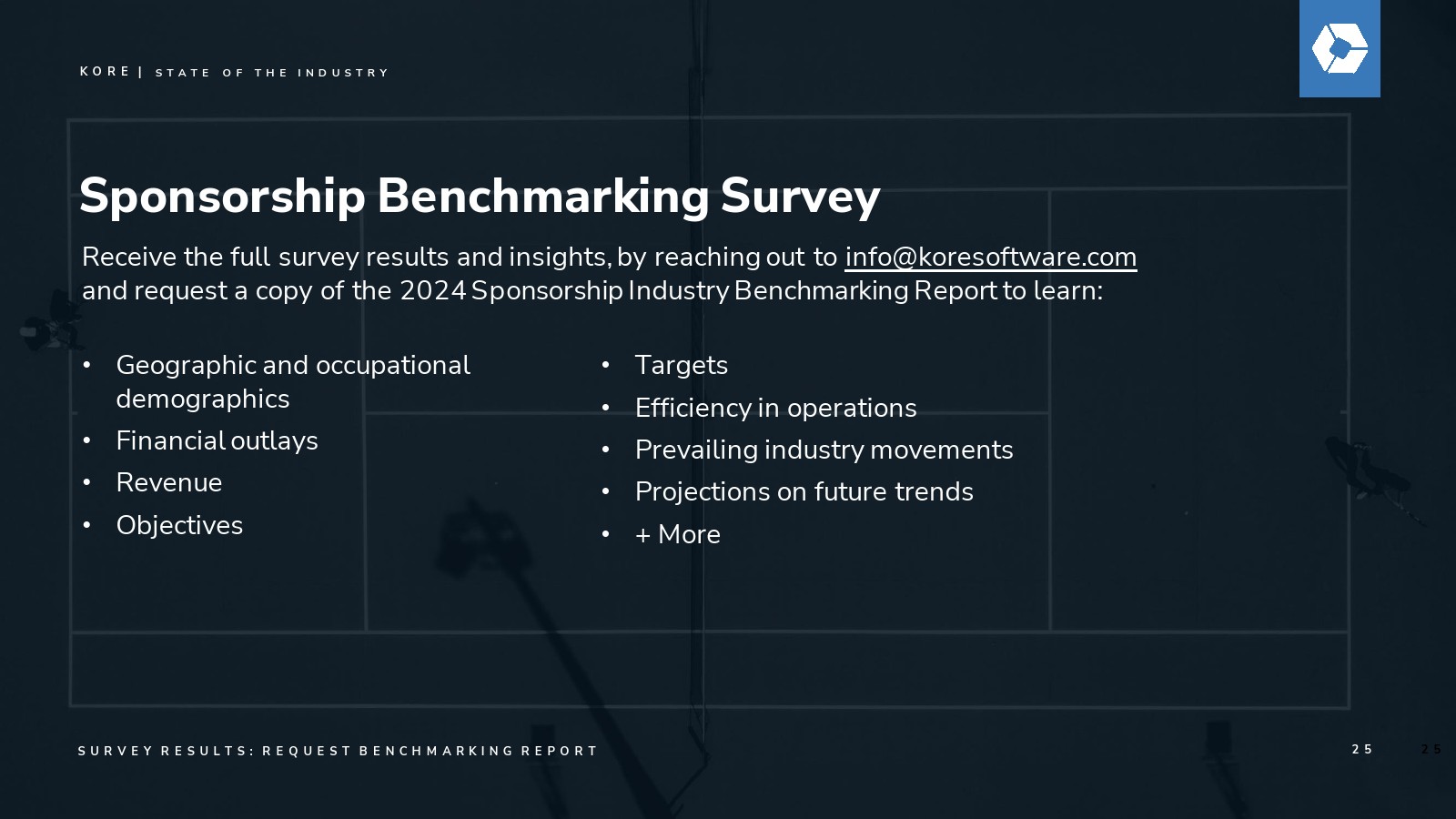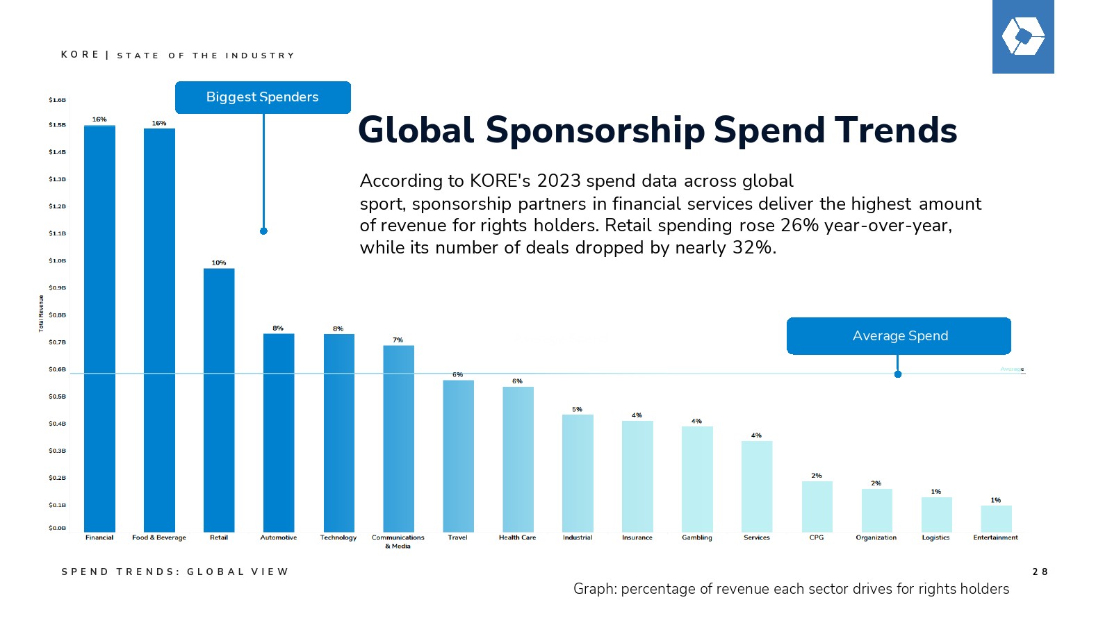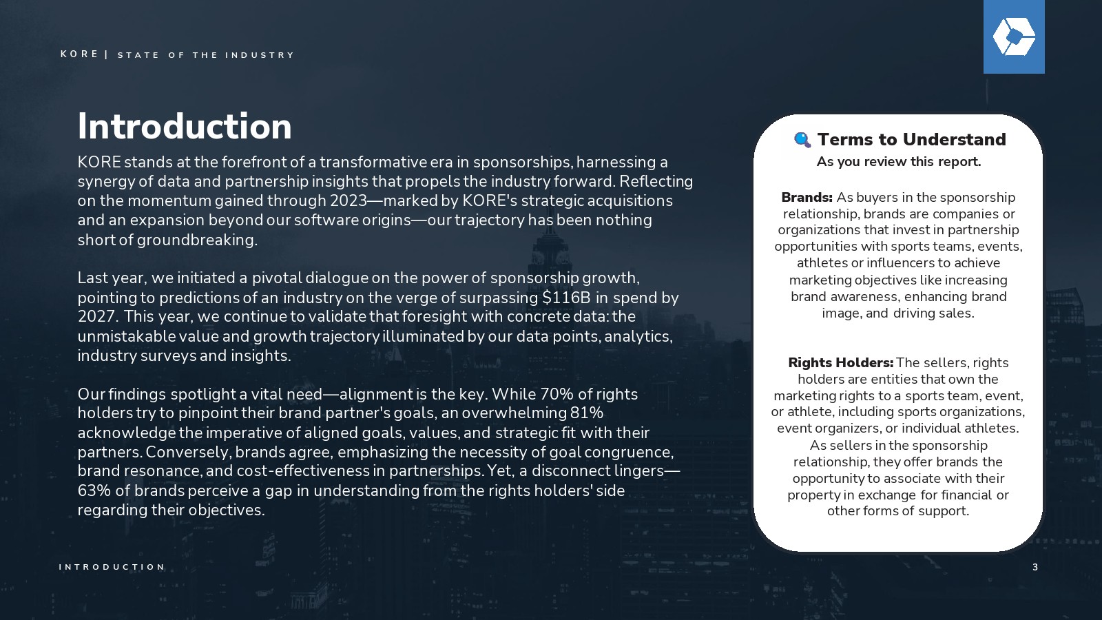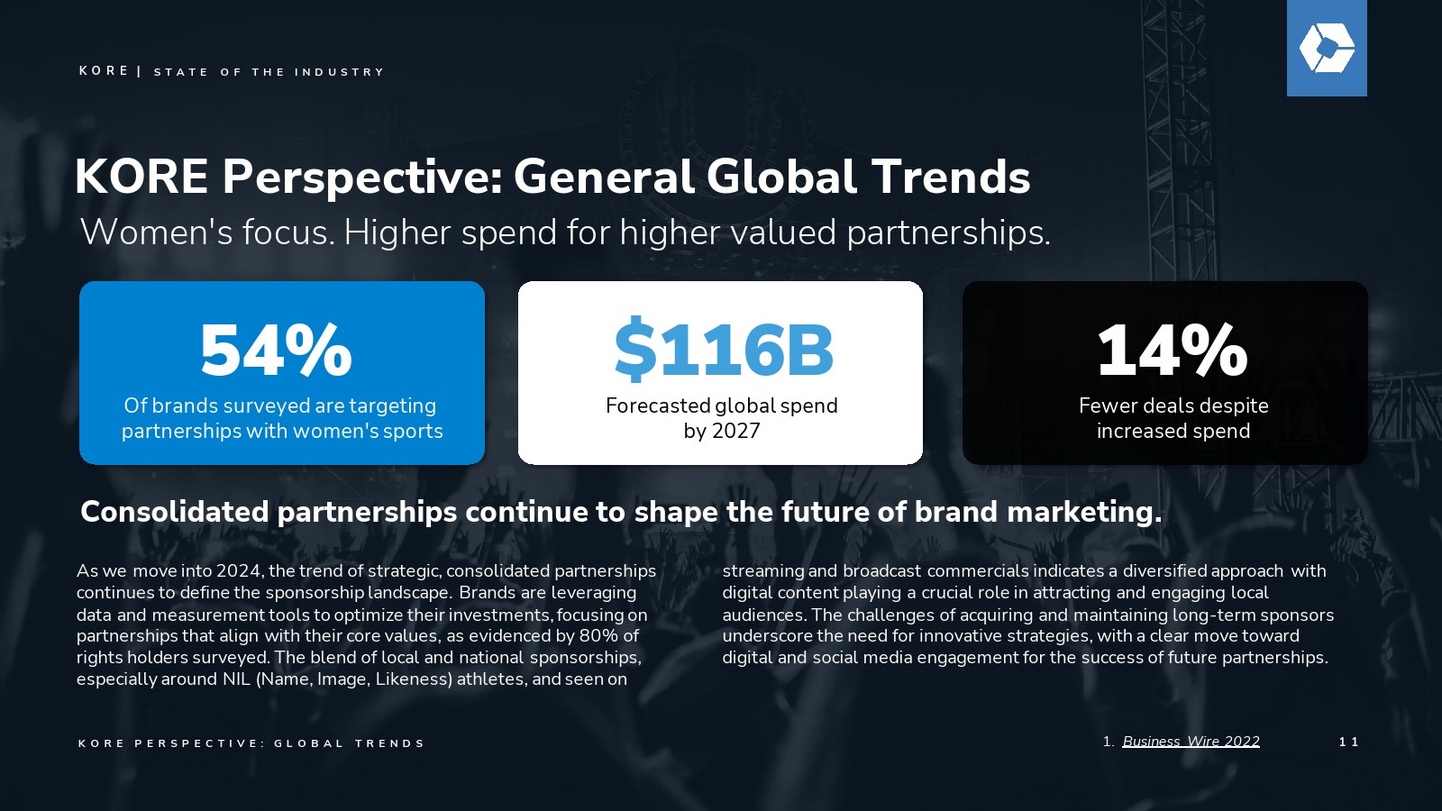 去年,KORE发起了一场关于赞助增长力量的关键对话,预测该行业将在2027年突破1160亿美元的支出规模。今年,我们继续用具体数据验证这一远见:通过我们的数据点、分析、行业调查和洞察所揭示的明确价值与增长轨迹。