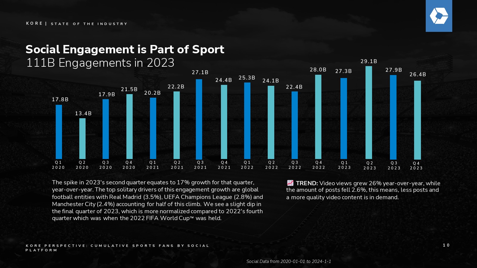 社交参与增长10%。这种参与度增长的最大动力是全球足球实体,其中皇家马德里(3.5%)、欧洲冠军联赛(2.8%)和曼城(2.4%)占了增长的一半。