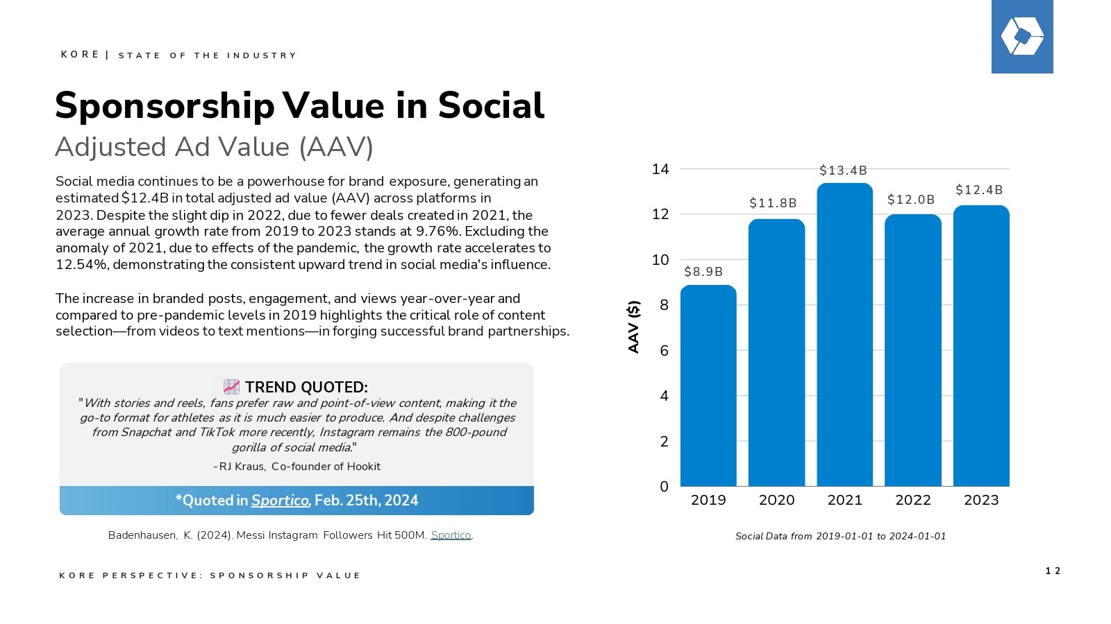 社交媒体仍然是品牌曝光的重要来源,预计2023年跨平台调整后广告价值(AAV)将达到124亿美元。尽管2022年略有下降,但由于2021年创造的交易减少,2019年至2023年的平均年增长率为9.76%。