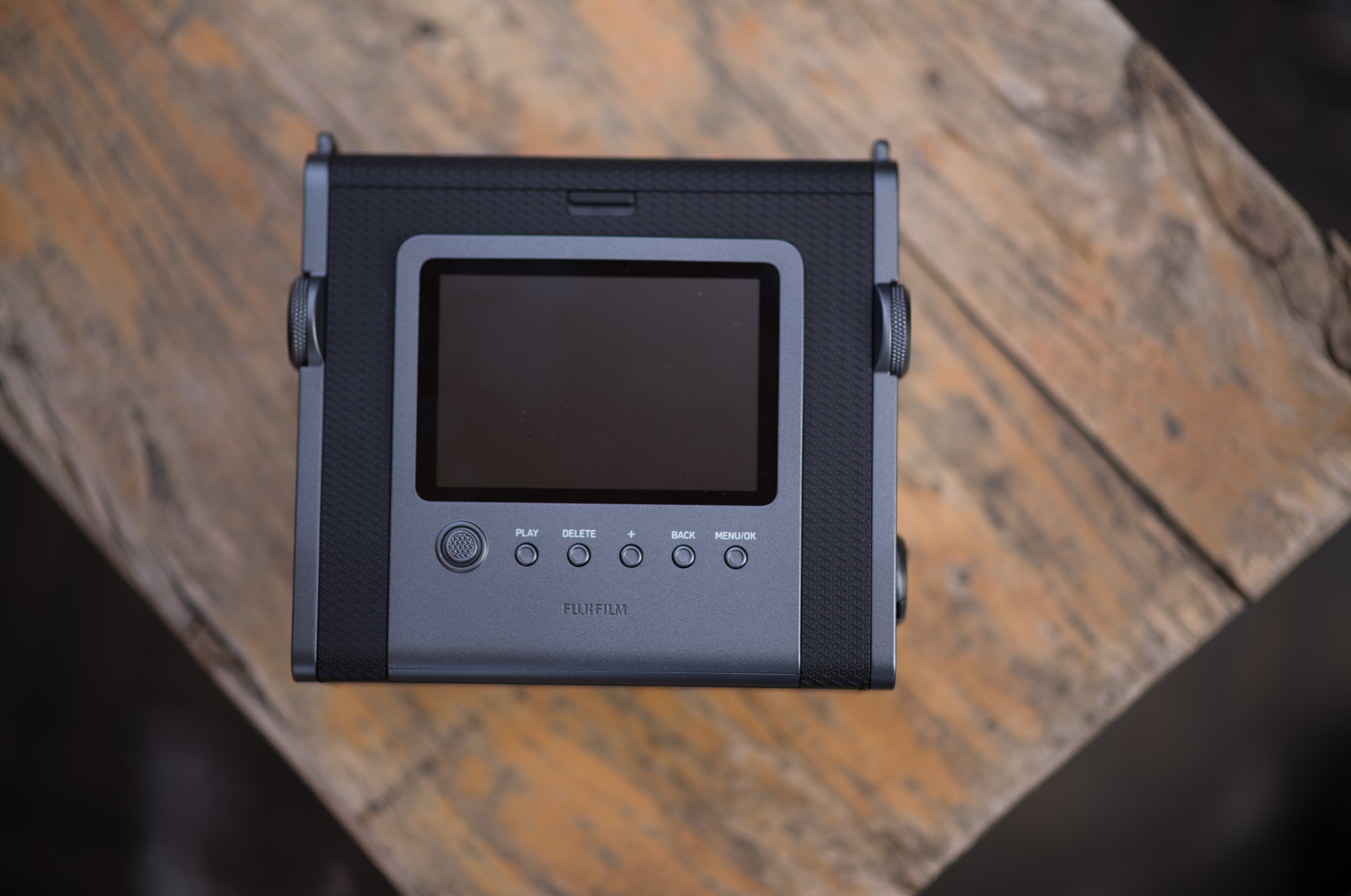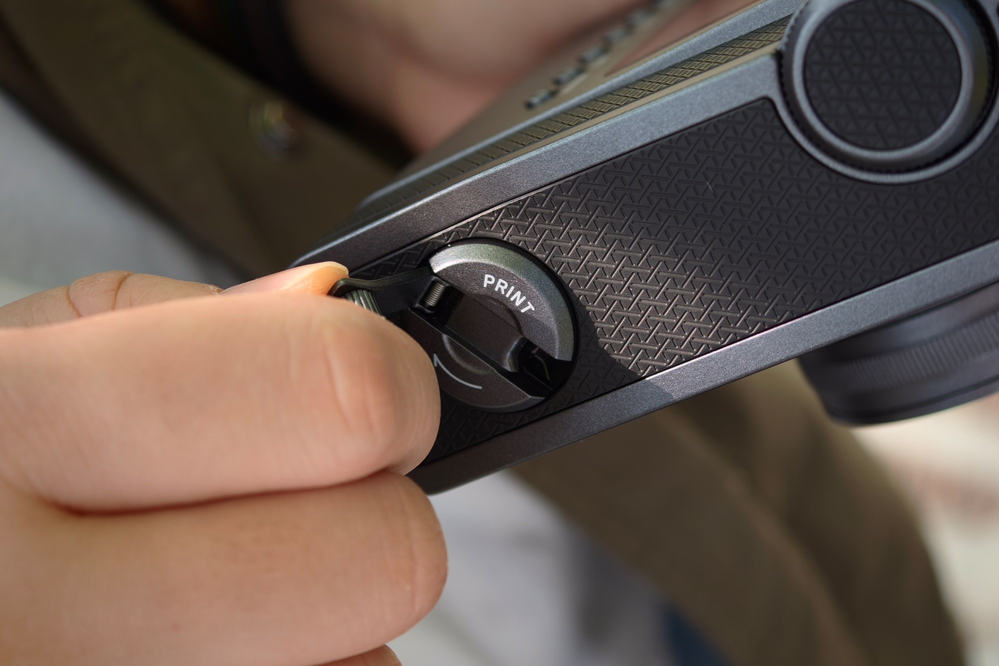 富士instax WIDE Evo机身两侧下部,一侧是相机的电源开关,另一侧是出片曲柄。当用户拍到满意的照片之后,旋转出片曲柄,即可将照片打印到相纸上,整个操作如同操控一台胶片相机,出片打印过程充满了仪式感。