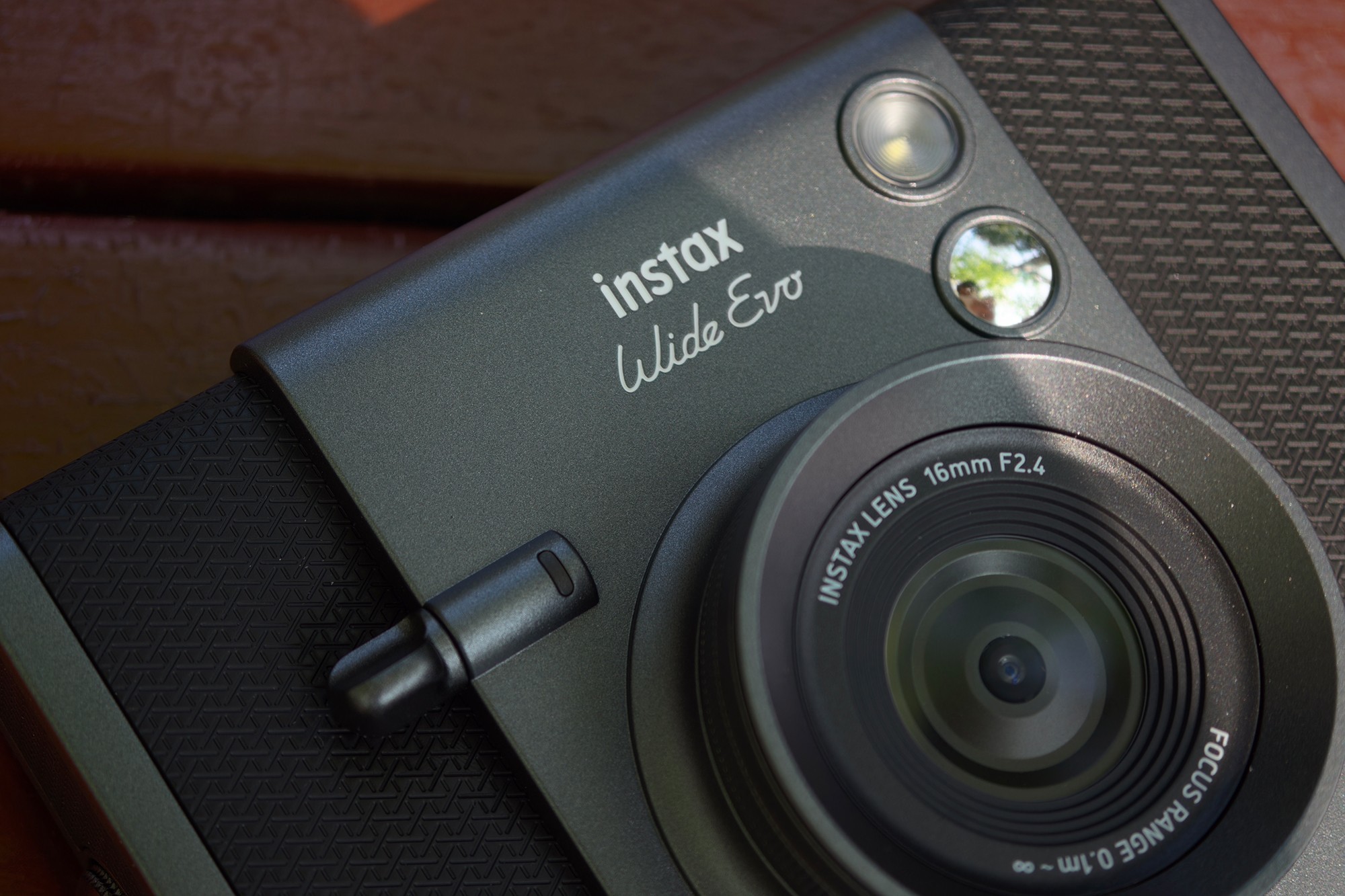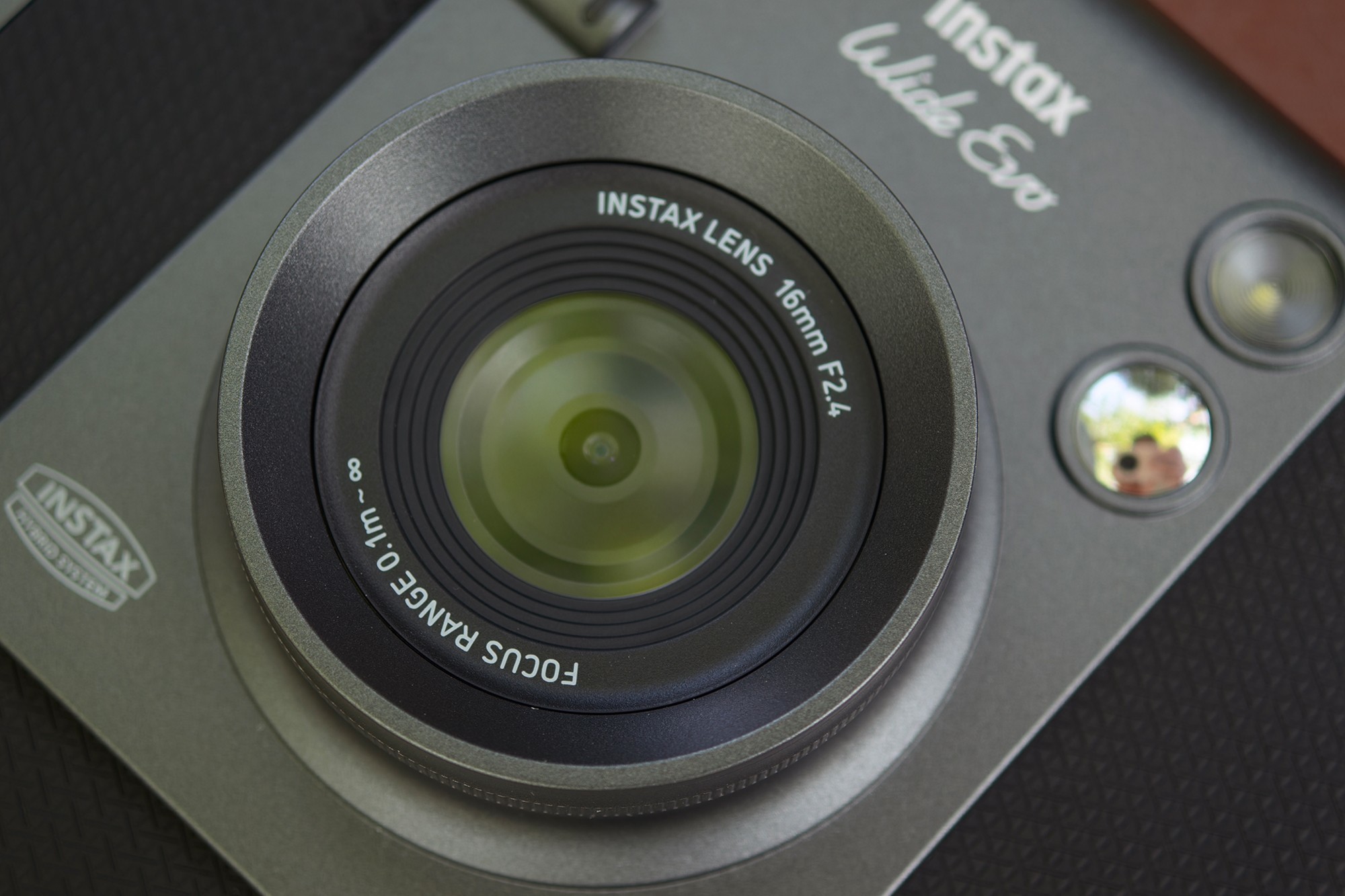 富士instax WIDE Evo机身正面,除了快门、自拍镜、闪光灯之外,在镜头右下还有广角开启键,开启之后相机可以以广角视角进行拍摄,不仅能够容纳更多环境元素,拍摄出更具冲击力的摄影作品,也满足多人合影拍摄需要。