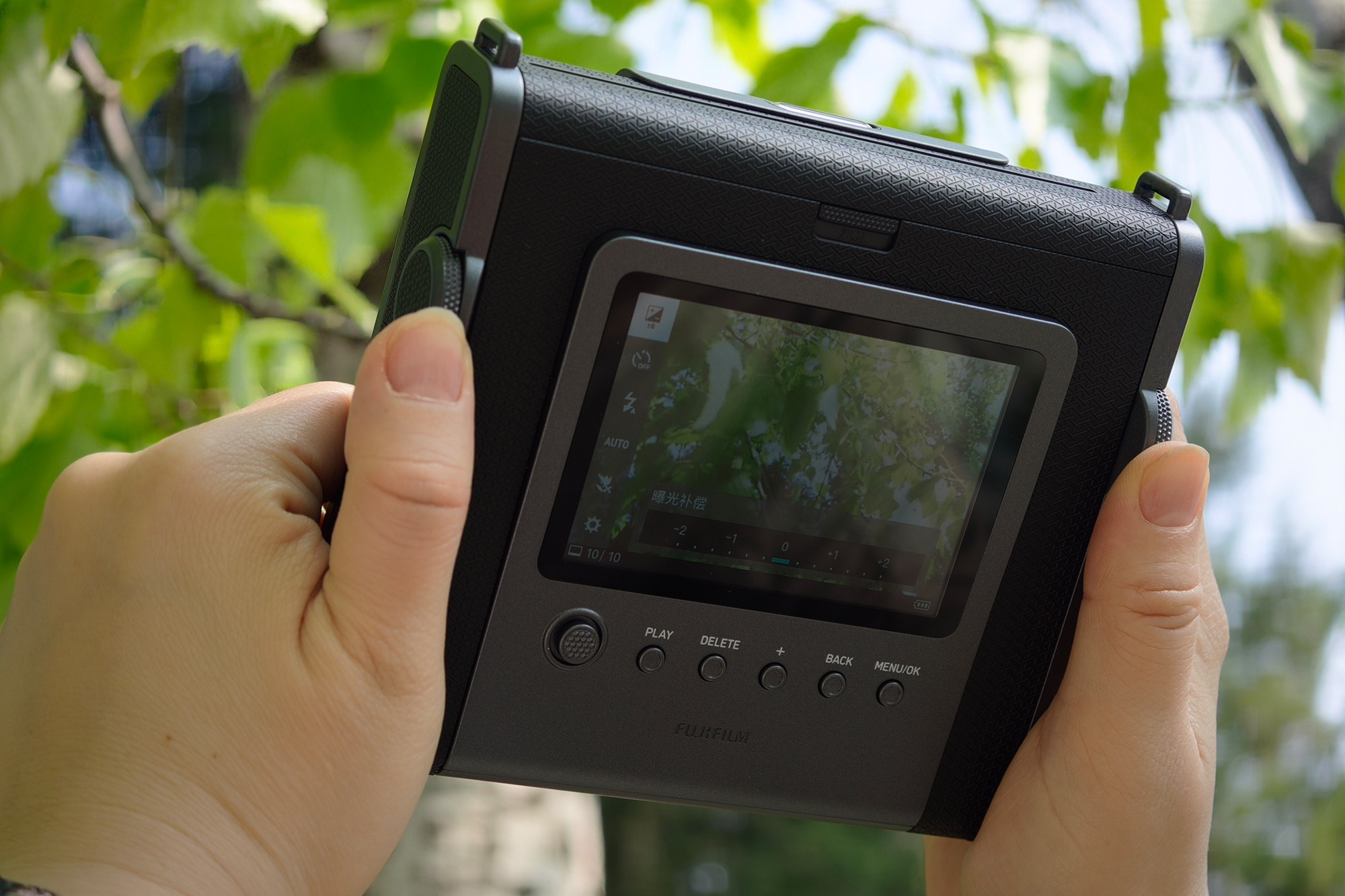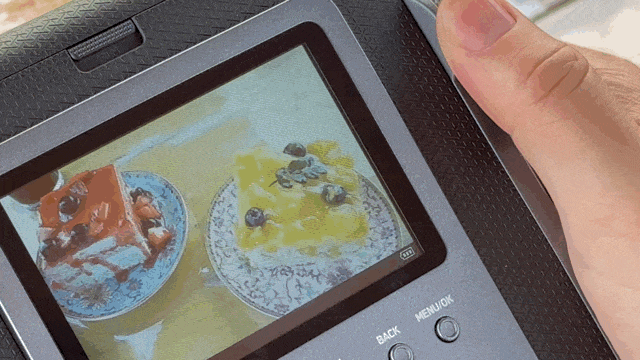 富士instax WIDE Evo机身背后是一块3.5英寸屏幕,用于取景和操作相机使用。屏幕下方排列着一排功能键,配合摇杆操作,可以快速完成相机功能设置、查看照片放大等操作,操作并不复杂。