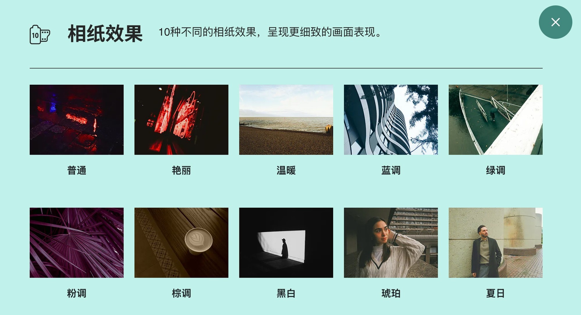 除了镜头效果之外,instax WIDE Evo还内置了10种胶卷效果,包含了普通、艳丽、温暖、蓝调、绿调、粉调、棕调、黑白、琥珀、夏日这10种胶片效果,与不同的镜头效果搭配,得到不同的照片风格。此外,在设置效果时,转动镜头上的控制环,还可以对胶片效果和镜头效果进行调整,便于用户得到更好的拍摄成片效果。