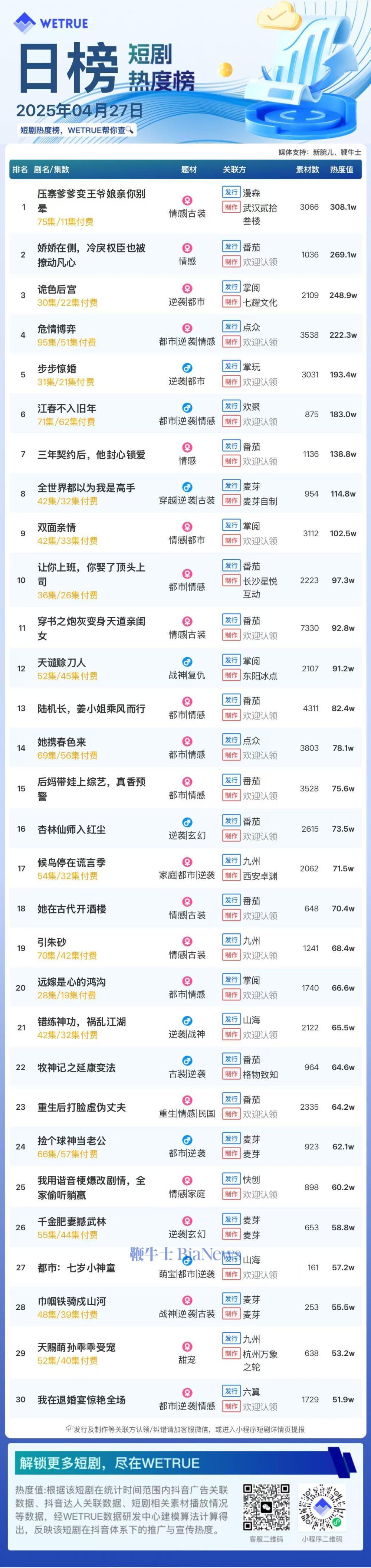 1、本日榜为WETRUE短剧数据公司提供,新腕儿和鞭牛士提供联合支持。