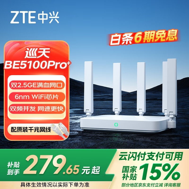 中兴巡天BE5100Pro+无线路由器搭载自研芯片支持双宽带入户