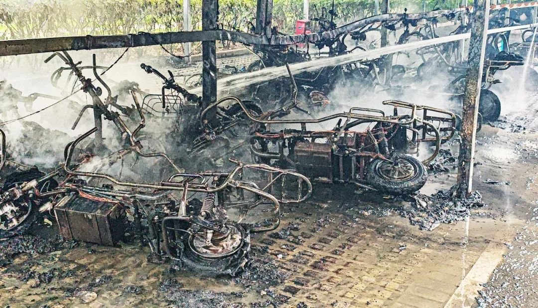 当消防员抵达时,现场的明火已被该小区物业人员奋力扑灭。然而,此时车棚里仍闪烁着未熄灭的火星,并且时不时传来微弱的爆炸声。