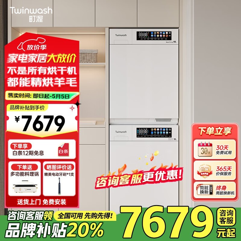町渥TwinWash洗烘套装嵌入式10kg洗衣机奶油色小方糖系列